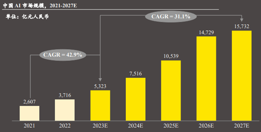 行業(yè)大模型要針對(duì)特定行業(yè)的具體需求,提供更加精細(xì)和個(gè)性化的解決方案,才是成為能夠滿足各個(gè)行業(yè)創(chuàng)新式發(fā)展的“Killer App”,也將是AI大模型行業(yè)在企業(yè)級(jí)市場(chǎng)實(shí)現(xiàn)發(fā)展的重要方向。根據(jù)市場(chǎng)調(diào)研的數(shù)據(jù)顯示,2022年中國人工智能行業(yè)市場(chǎng)規(guī)模為3,716億人民幣,預(yù)計(jì)2027年將達(dá)到15,372億人民幣,有望在下游金融制造、交通、醫(yī)療等多領(lǐng)域不斷滲透,實(shí)現(xiàn)大規(guī)模落地應(yīng)用。
