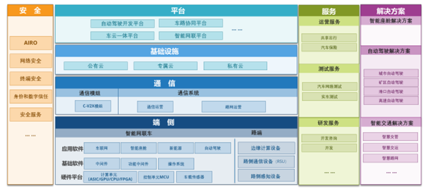 中國(guó)車聯(lián)網(wǎng)市場(chǎng)涉及到車聯(lián)網(wǎng)平臺(tái)、路側(cè)基礎(chǔ)設(shè)施、通信系統(tǒng)、車聯(lián)網(wǎng)安全和服務(wù)等,具體來說路側(cè)設(shè)施主要包括路側(cè)感知設(shè)備、路側(cè)計(jì)算設(shè)備、路側(cè)通信設(shè)備等。 通信系統(tǒng)指車端、路端通信所需的必要基礎(chǔ)設(shè)施。車聯(lián)網(wǎng)平臺(tái)基礎(chǔ)設(shè)施為平臺(tái)提供基礎(chǔ)的計(jì)算、存儲(chǔ)、網(wǎng)絡(luò)資源;根據(jù)部署形態(tài)可分為公有云、私有云、專屬云等。車聯(lián)網(wǎng)平臺(tái)是指利用車載設(shè)備與路端設(shè)備提供的信息,完成數(shù)據(jù)處理與應(yīng)用服務(wù)的綜合性平臺(tái)。車聯(lián)網(wǎng)安全涵蓋了車聯(lián)網(wǎng)領(lǐng)域各個(gè)環(huán)節(jié)所需的安全軟件、硬件及服務(wù)。具體而言,車聯(lián)網(wǎng)安全市場(chǎng)包括安全分析、情報(bào)、響應(yīng)和編排(AIRO)、網(wǎng)絡(luò)安全、終端安全、身份和數(shù)字信任、安全服務(wù)。服務(wù)貫穿車聯(lián)網(wǎng)各個(gè)領(lǐng)域,涉及研發(fā)、測(cè)試、運(yùn)營(yíng)等各類服務(wù)。