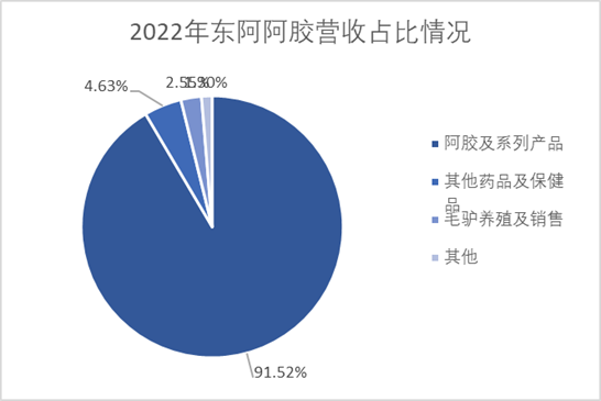 2023年前三季度實(shí)現(xiàn)營業(yè)收入34.28億元,同比增長12.54%;實(shí)現(xiàn)歸母凈利潤7.84億元,同比增長52.83%。2022年主營產(chǎn)品包括阿膠及系列產(chǎn)品、其他藥品及保健品、毛驢養(yǎng)殖及銷售,分別占整體營收的91.52%、4.63%、2.55%。