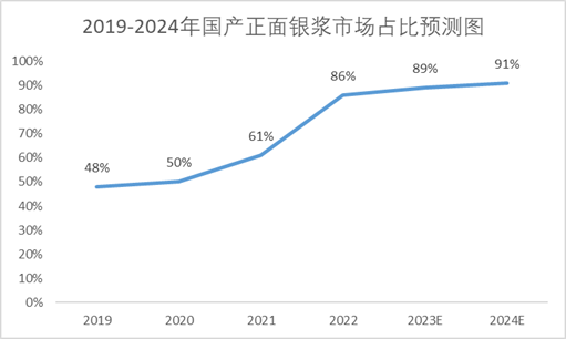 圖表 1 2019-2024年國產(chǎn)正面銀漿市場(chǎng)占比預(yù)測(cè)圖