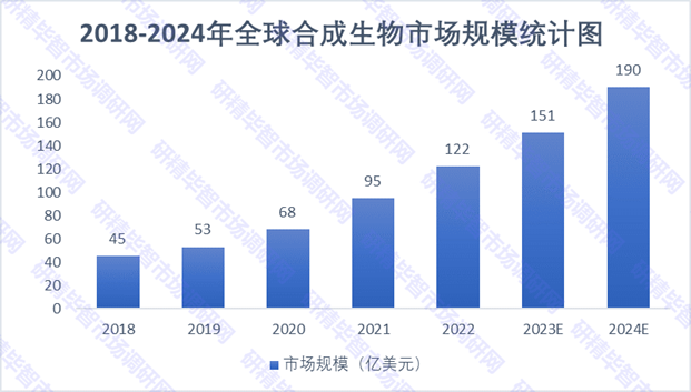 隨著底層使能技術(shù)的突破和基礎(chǔ)研究的深入,在工業(yè)化研究平臺(tái)的助力下,合成生物學(xué)正向醫(yī)療、化工、能源、食品、消費(fèi)、農(nóng)業(yè)等眾多領(lǐng)域進(jìn)行延伸,部分國內(nèi)外企業(yè)已初步實(shí)現(xiàn)“從1到N”,整體市場(chǎng)規(guī)模呈現(xiàn)爆發(fā)式增長(zhǎng)。根據(jù)市場(chǎng)調(diào)研統(tǒng)計(jì)的數(shù)據(jù)報(bào)告顯示,2021年全球合成生物市場(chǎng)規(guī)模達(dá)到95億美元,2023年約151億美元,研精畢智分析師預(yù)測(cè),2024年將達(dá)190億美元,2026年將達(dá)到307億元。