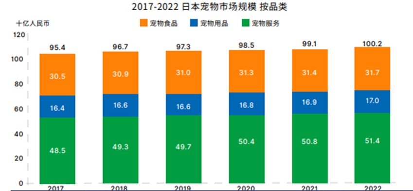 行業(yè)研究報告指出,日本寵物市場已進入成熟期,市場規(guī)模相對穩(wěn)定,2017年至2022年,日本寵物市場規(guī)模從954億人民幣增長至1,002億人民 幣,期間復(fù)合年化增長率為1.0%。 分品類看,日本的寵物服務(wù)市場高度發(fā)達,作為全球?qū)櫸锸袌鲋?最為發(fā)達和完善的地區(qū)之一,日本的寵物消費產(chǎn)業(yè)鏈非常成熟, 除基礎(chǔ)的寵物食品、玩具、生活用品外,寵物服務(wù)如寵物美容、 寵物旅行、寵物醫(yī)療等細分行業(yè)也非常成熟。2022年,日本寵 物服務(wù)市場規(guī)模達514億人民幣,為整體寵物行業(yè)中占比最大的 板塊。