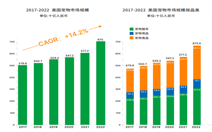 隨著寵物數(shù)量增長、寵物主對寵物健康和福利越來越關(guān)注,美國寵物市場持續(xù)增長,市場規(guī)模從2017年時4,796億人民幣增 長至2022年的6,750億人民幣,期間復(fù)合年增長率增速7.1%。 分品類看,2022年美國寵物食品市場規(guī)模達2,870億人民幣, 為過去5年增長最快的品類,這主要是受益于寵物主越來越注 重為寵物提供高質(zhì)量、營養(yǎng)豐富的食品,以及新型寵物食品的 推出等。寵物用品市場為增速第二的品類,2022年市場規(guī)模 達741億人民幣,個性化、智能化的寵物用品占比不斷提升,也 帶動了整體寵物用品行業(yè)的發(fā)展。