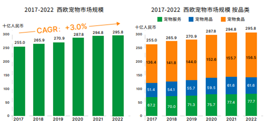分品類看,2022年西歐寵物市場中占比最高的為寵物食品, 規(guī)模達1,565億人民幣,這主要是由于西歐的寵物主越來越注 重寵物食品的質(zhì)量和安全性,這一點從西歐寵物食品市場越來 越多的“Human Grade”,即達到符合人類食品安全標(biāo)準(zhǔn)的寵 物食品中也能反映出來。此外,寵物用品行業(yè)在過去5年的市 場增速最快,主要是受產(chǎn)品智能化、多樣化等因素推動,2022年西歐寵物用品市場規(guī)模達616億人民幣。