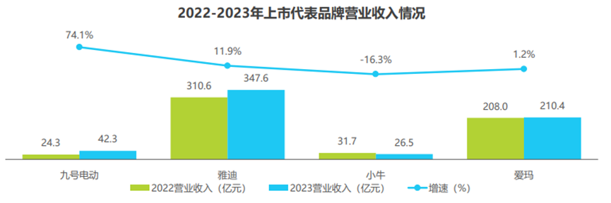 研究報(bào)告指出,2023年,上市品牌中九號、雅迪、愛瑪營業(yè)收入均呈現(xiàn)一定幅度的增長,而小牛由于銷量下滑,營業(yè)收入下降16.3%;九號在高端 兩輪電動車市場進(jìn)一步發(fā)展,單車平均收入2876.2元,并且M系列、Dz 110P等高端車型售價(jià)均在萬元,相比之下傳統(tǒng)品牌代表雅 迪的單車平均收入下降至1488.2元。