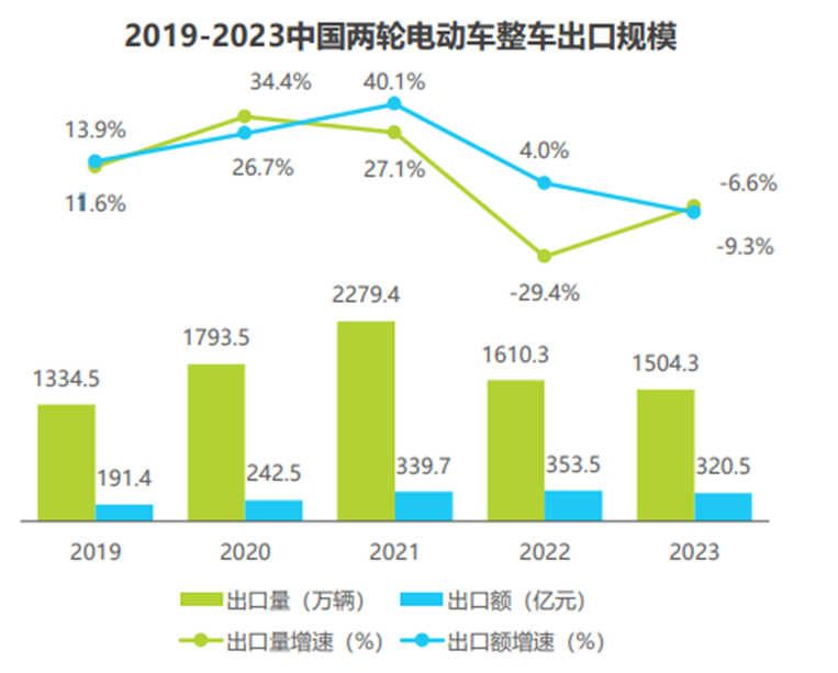 市場調(diào)研數(shù)據(jù)顯示,2023年中國兩輪電動車整車出口量為1504.3萬輛,出口額為320.5億元,同比下降6.6%和9.3%,下滑速度放緩;出口規(guī) 模前四的省份,出口量均達(dá)到百萬級;2021年疫情導(dǎo)致海外兩輪電動車市場火爆,相應(yīng)帶動中國兩輪電動車出口量劇增,高峰期過 后市場回歸正常,預(yù)計(jì)未來進(jìn)入穩(wěn)定增長期。